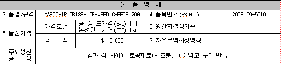 그러므로 품명 및 규격은 인보이스 등의 수출서류와 일치 시켜 줍니다.