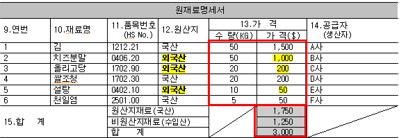 금액적으로 원산지 재료는 1,750$ , 비원산지재료는 1,250$ 가 되겠군요.