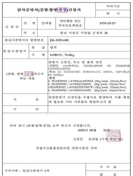- TIP : 품명, 신청인 변경등 증명서에 기입하고자 하는 영문이 있을 경우 기타문서에 첨부하여 수정요청합니다.