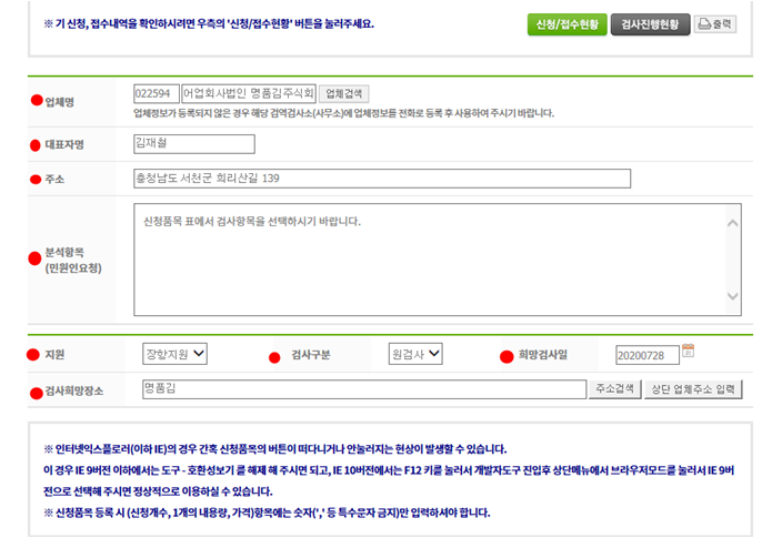 아래 순서대로 업체명, 대표자명, 주소, 분석항목, 지원등 선택을 해줍니다.