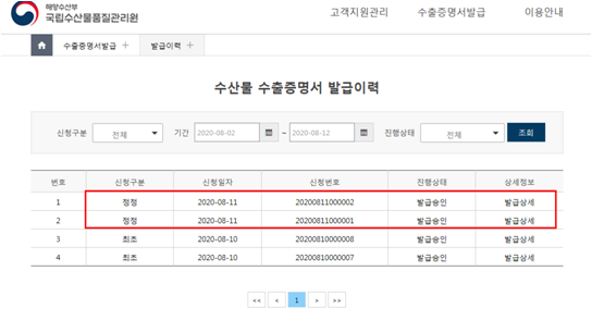 - "신청" 버튼 클릭 후 수산물 수출증명서 발급이력 페이지가 나옵니다.