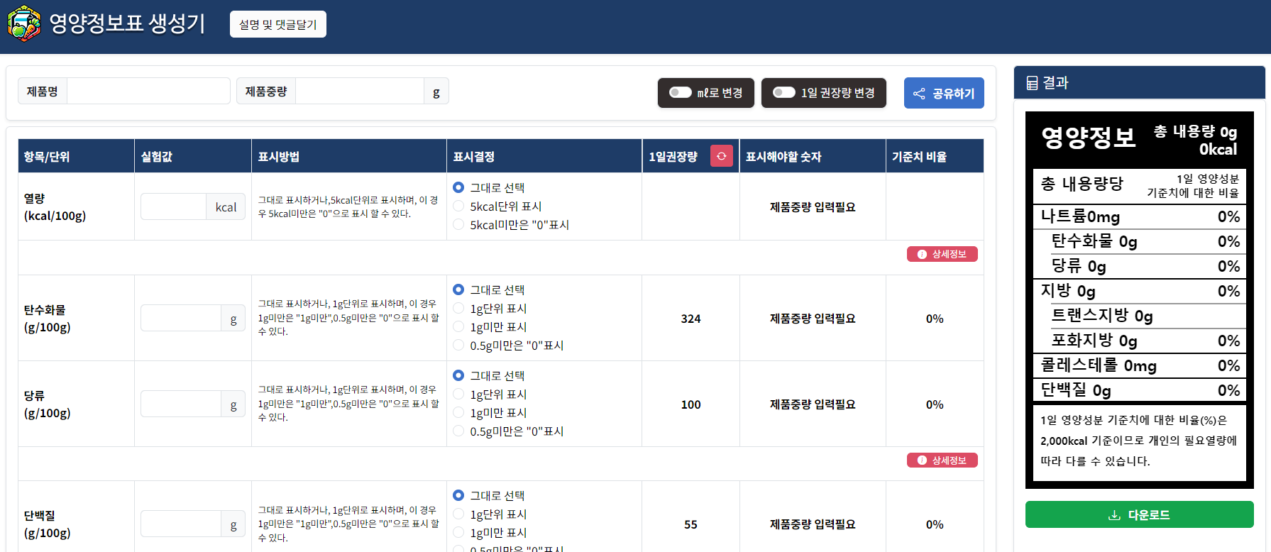 3. 2024년 5월 17일부로 업데이트된 "영양정보표 생성기"를 올립니다.
