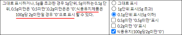 4. 1g미만 표시 - 선택을 하게 되면, 결과값이 1g 미만 경우 자동으로 영양정보표 상에 "1g 미만" 표시가 됩니다.