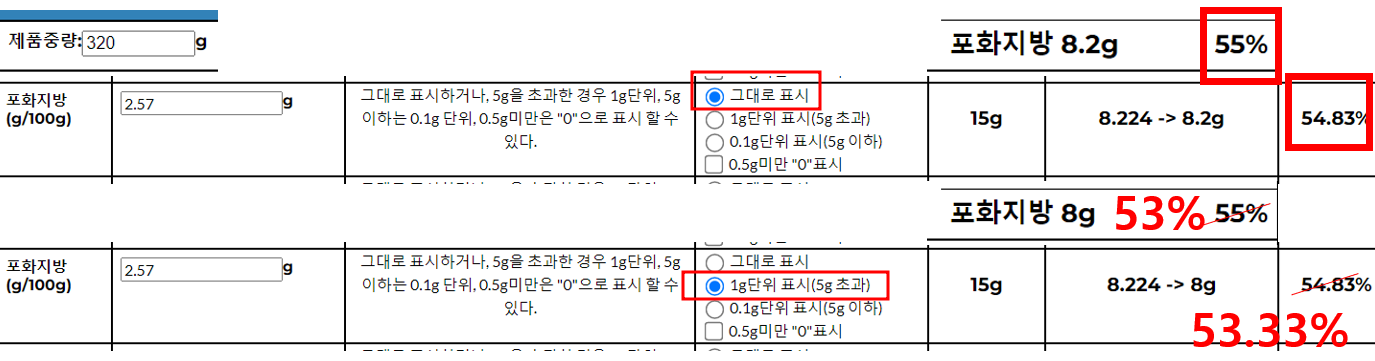 제품중량 320g / 포화지방 2.57(100g당) 을 입력하면, 기준치 비율% 값이 "그대로 표시" 와 "1단위표시(5g초과)"가 같은 값이 나오지 않고, 달라야 한다고 오류 제기를 해 주셨습니다.