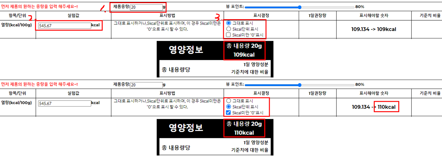 위 내용으로 실험값은 동일하지만, 표시방법에 따라 영양정보표에 넣을 수 있는 결과값이 달라짐을 알 수 있습니다.